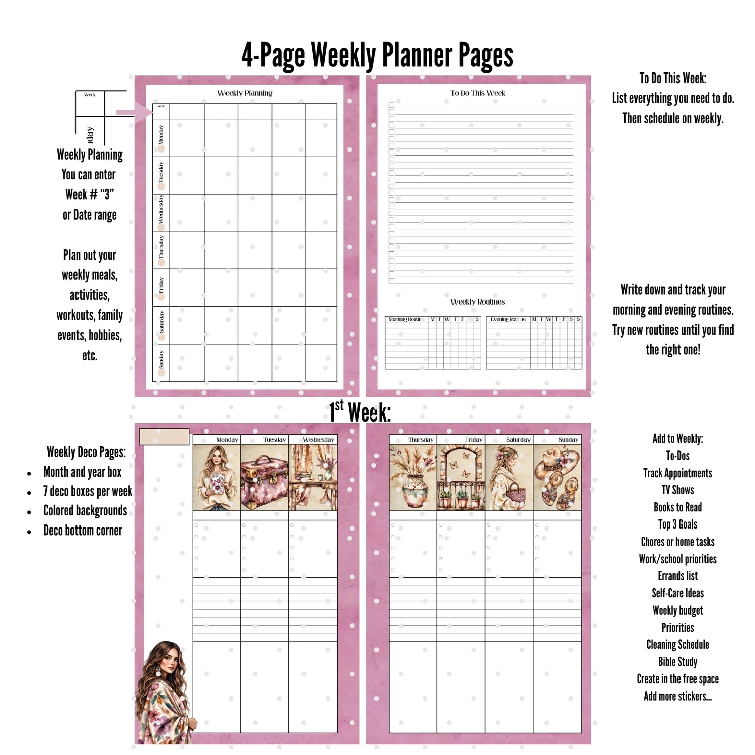 - Third and Fourth Pages: 2-Page Weekly spread with 7 custom deco boxes. (Five weeks x seven deco boxes each week = 35 deco boxes total)