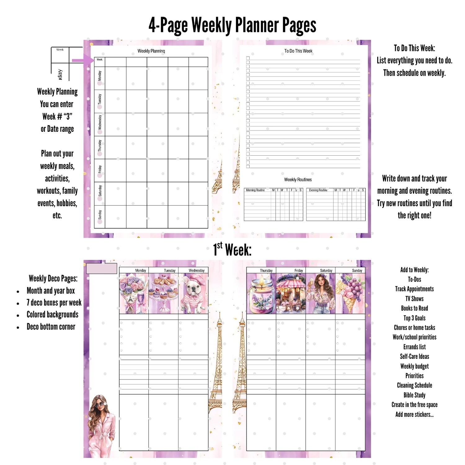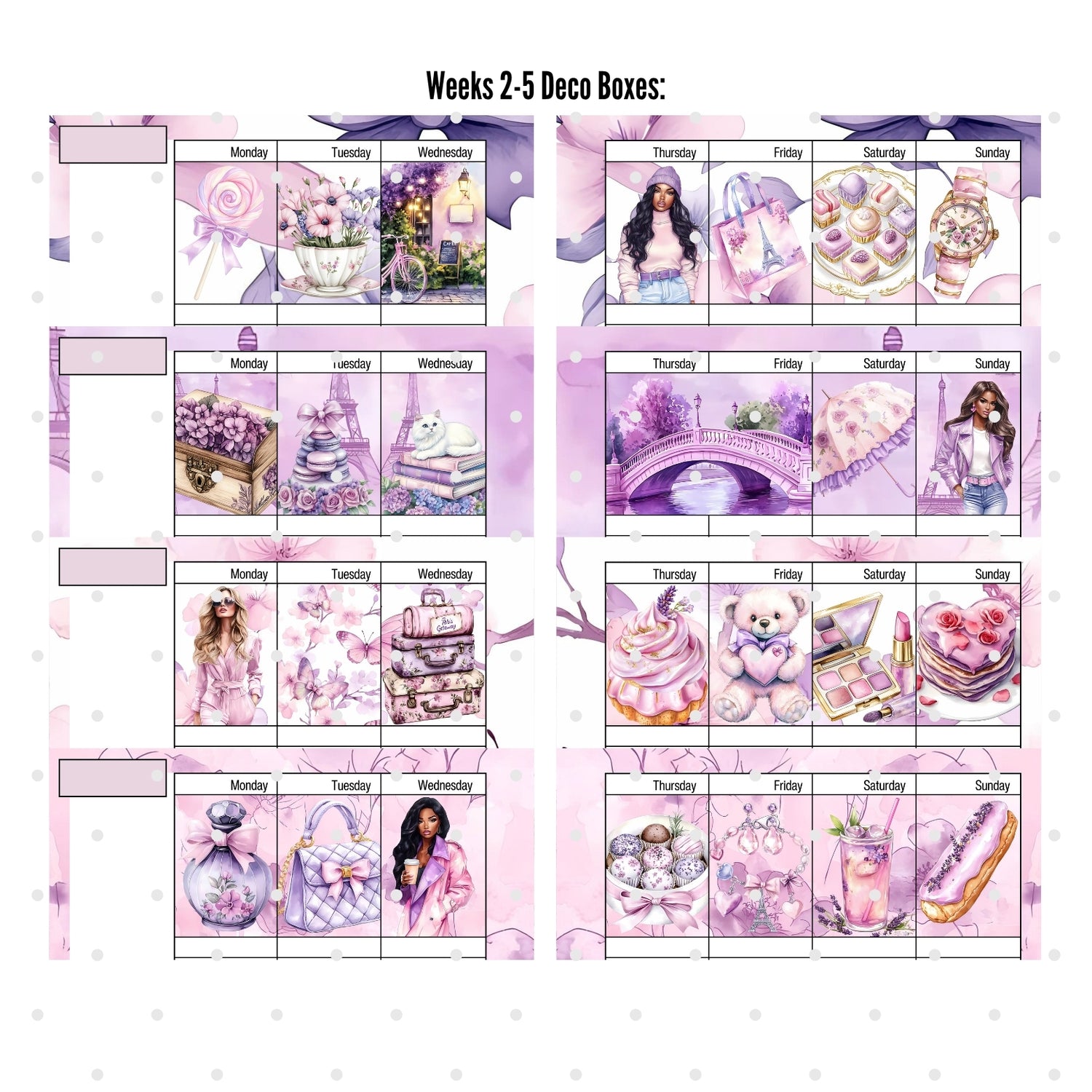 - Third and Fourth Pages: 2-Page Weekly spread with 7 custom deco boxes. (Five weeks x seven deco boxes each week = 35 deco boxes in all)
