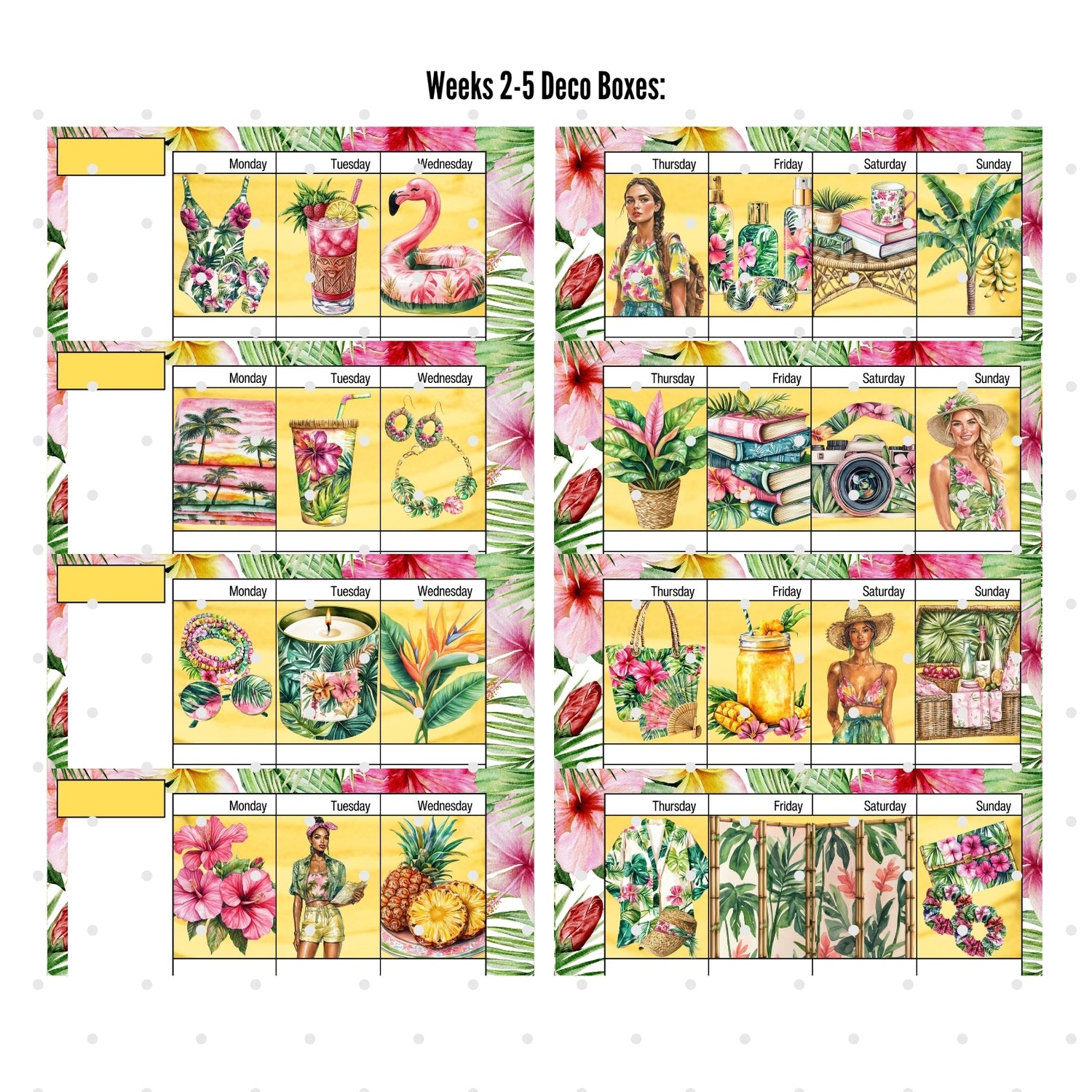- Third and Fourth Pages: 2-Page Weekly spread with 7 custom deco boxes. (Five weeks x seven deco boxes each week = 35 deco boxes in all)