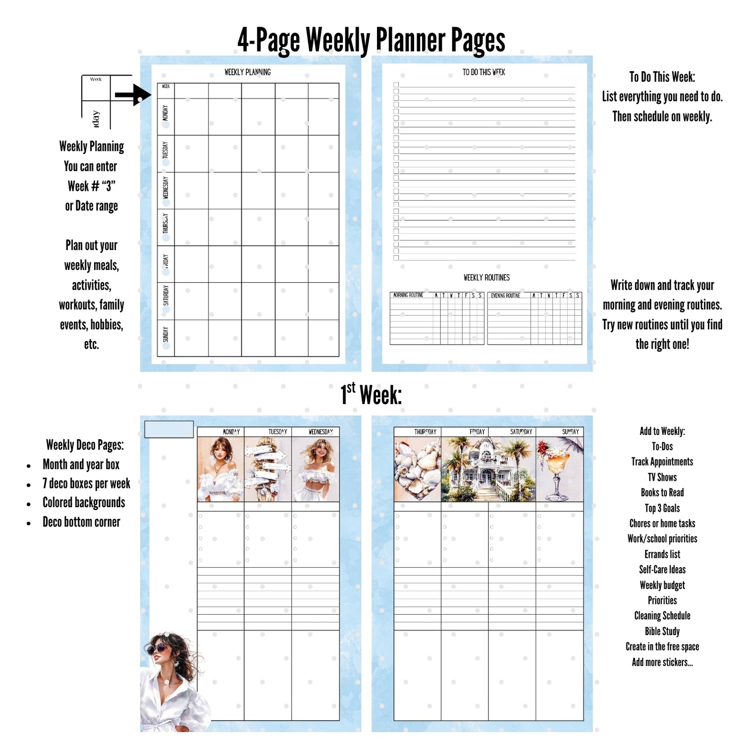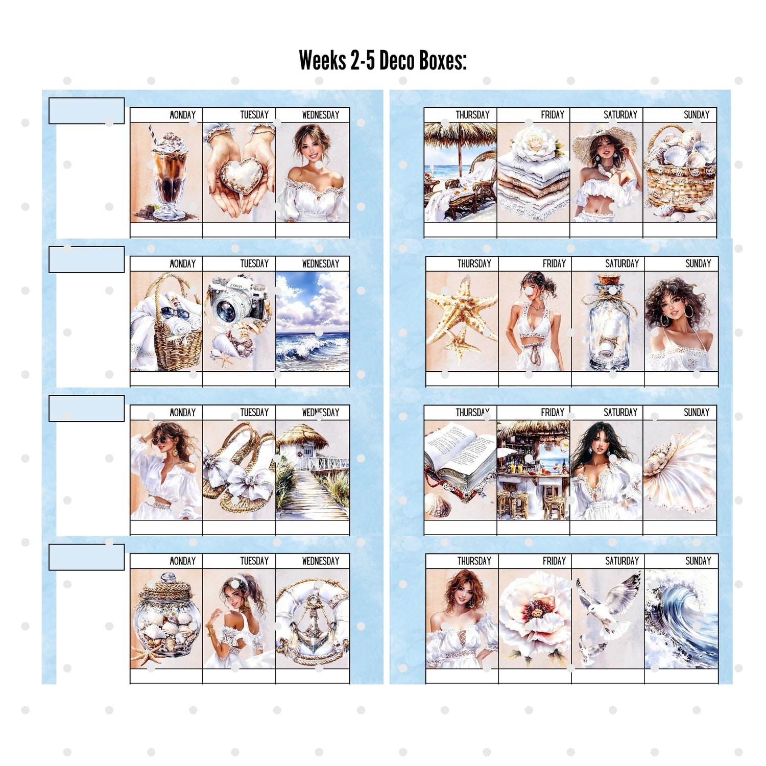- Third and Fourth Pages: 2-Page Weekly spread with 7 custom deco boxes. (Five weeks x seven deco boxes each week = 35 deco boxes in all)