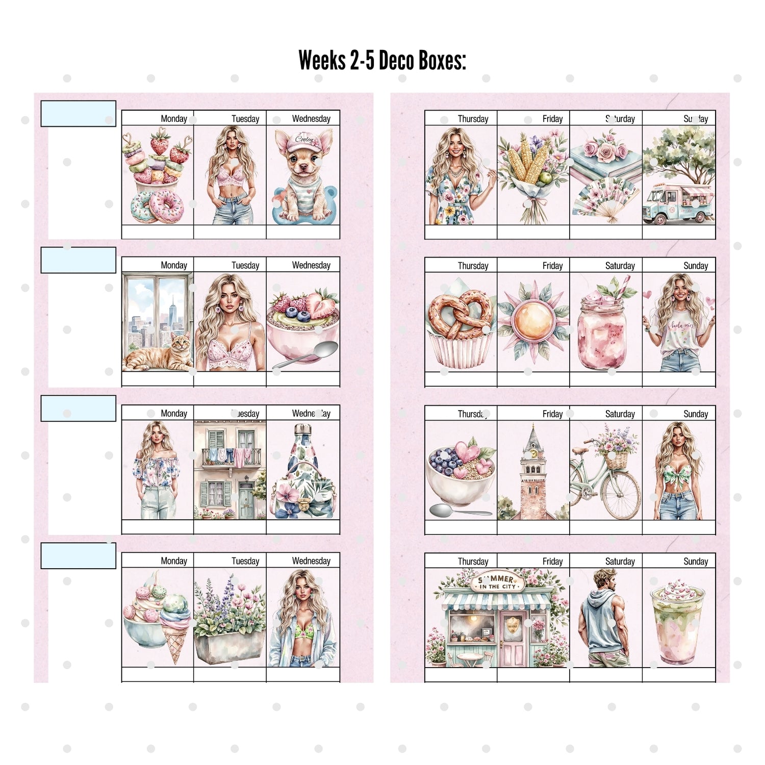 - Third and Fourth Pages: 2-Page Weekly spread with 7 custom deco boxes. (Five weeks x seven deco boxes each week = 35 deco boxes in all)
