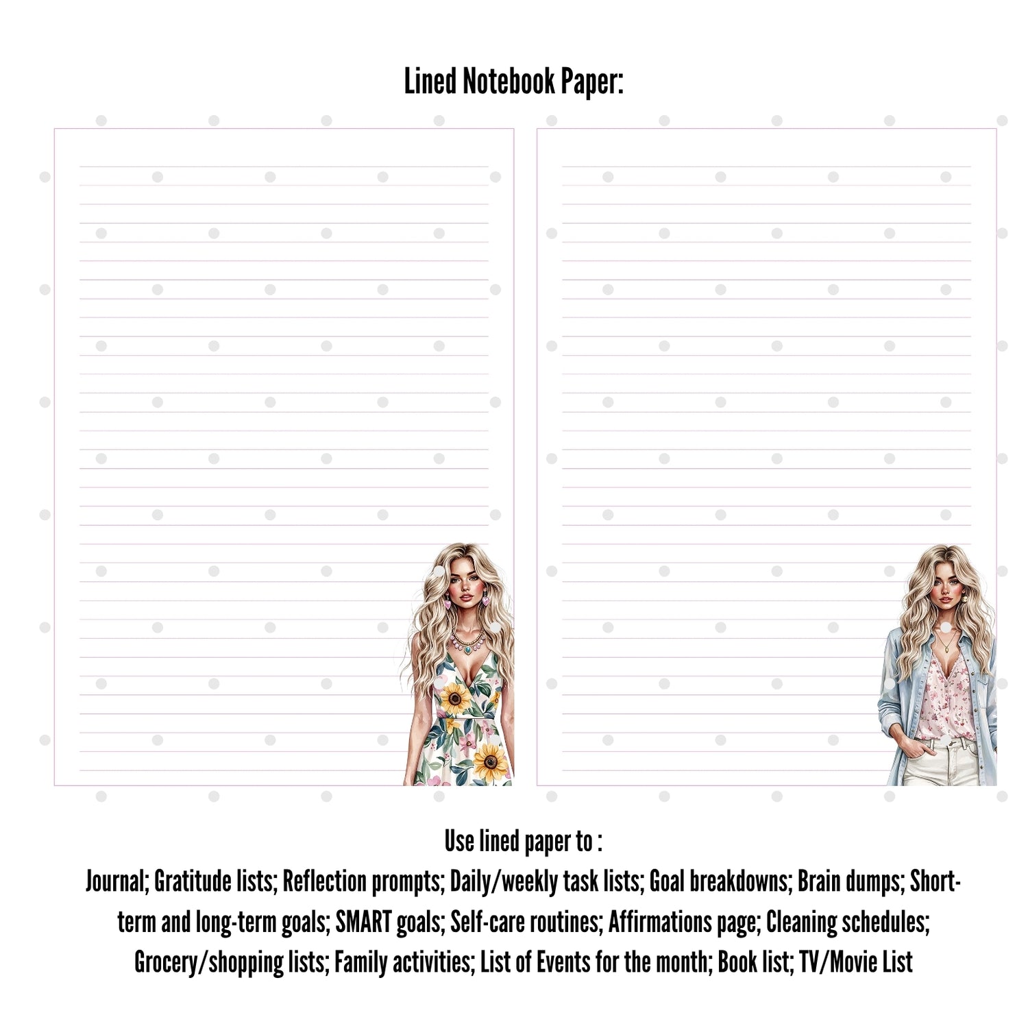 - First Page: Weekly planning – Plan out your weekly meals, activities, workouts, family events, hobbies, etc.