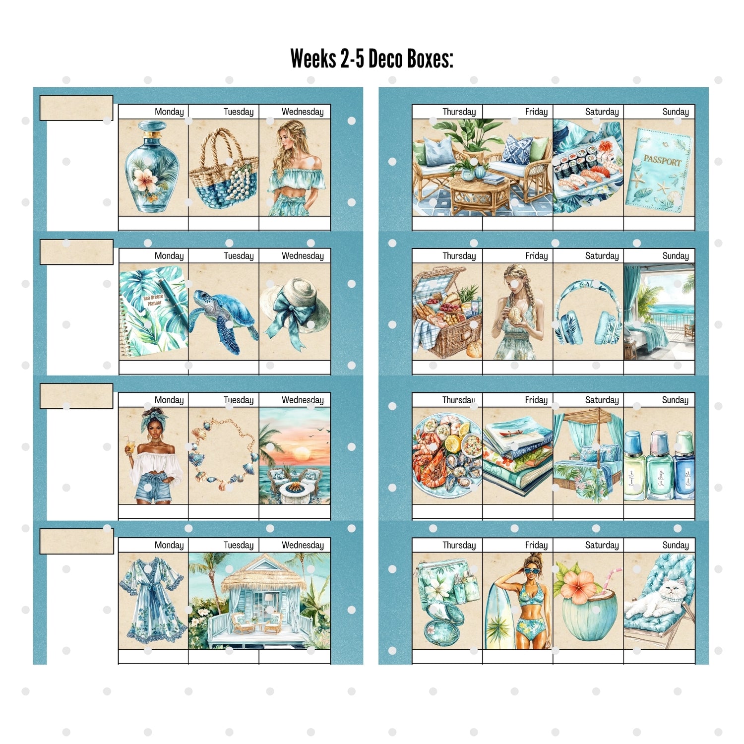 - Third and Fourth Pages: 2-Page Weekly spread with 7 custom deco boxes. (Five weeks x seven deco boxes each week = 35 deco boxes in all)