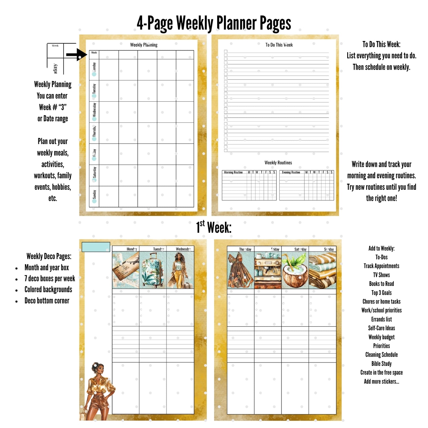 - Third and Fourth Pages: 2-Page Weekly spread with 7 custom deco boxes. (Five weeks x seven deco boxes each week = 35 deco boxes in all)