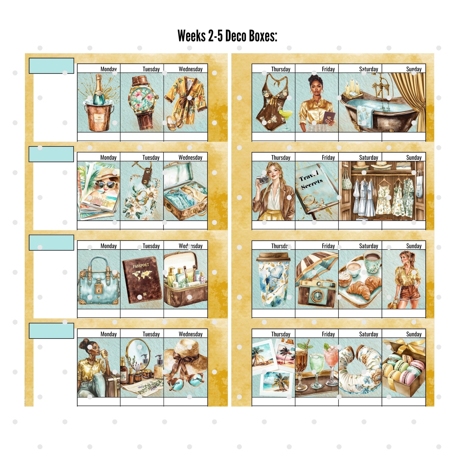 - Third and Fourth Pages: 2-Page Weekly spread with 7 custom deco boxes. (Five weeks x seven deco boxes each week = 35 deco boxes in all)
